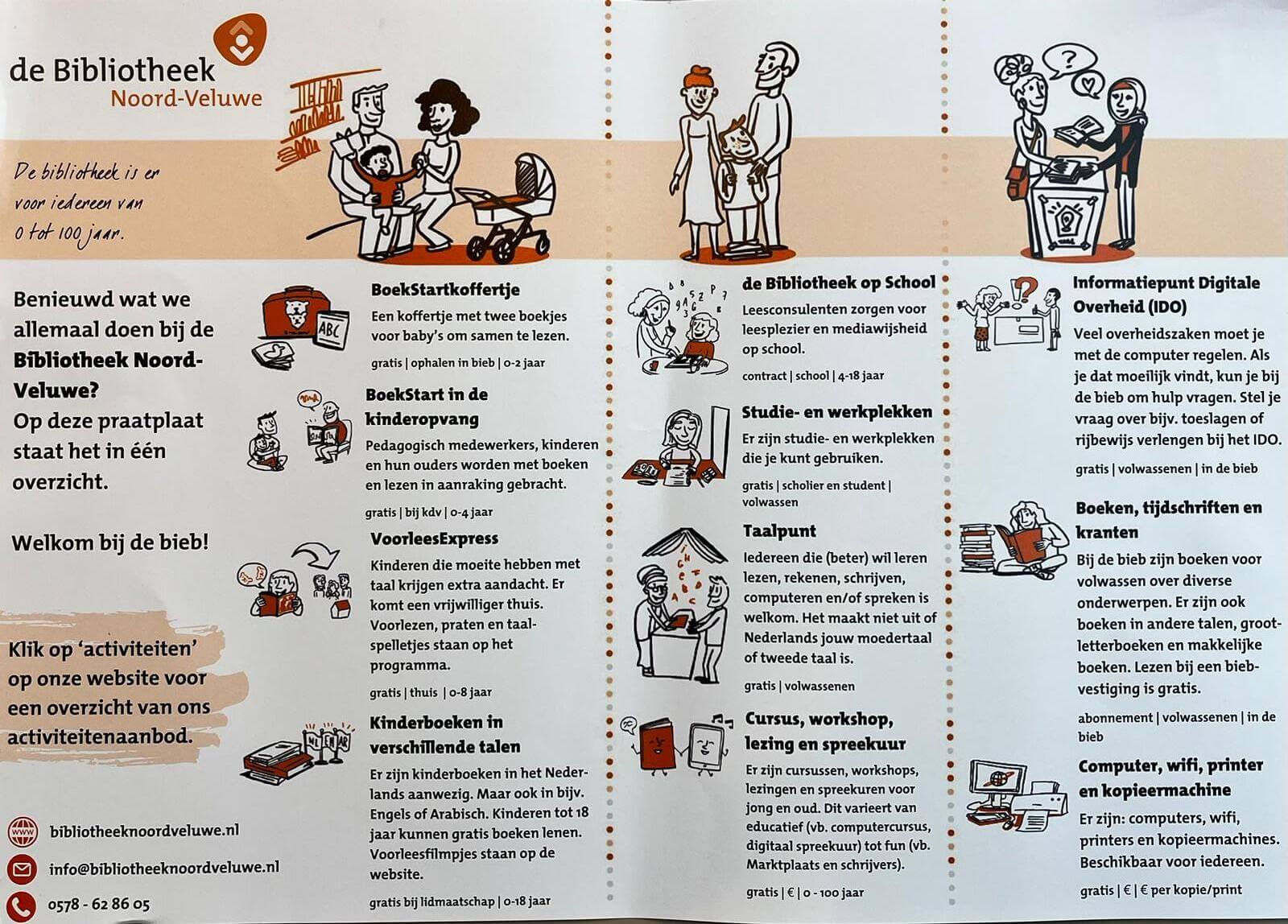 De bibliotheek doet meer dan alleen het uitlenen van boeken. Het is gericht op het verlenen van informatie en de basisvaardigheden taal, rekenen en digitale vaardigheden. Daarvoor worden allerlei ‘activiteiten’ voor georganiseerd zoals VoorleesExpress, Taalpunt, Informatiepunt Digitale Overheid (IDO). Zie ook de praatplaat voor een mooi overzicht. Dit alles wordt ook mogelijk gemaakt door vele vrijwilligers.